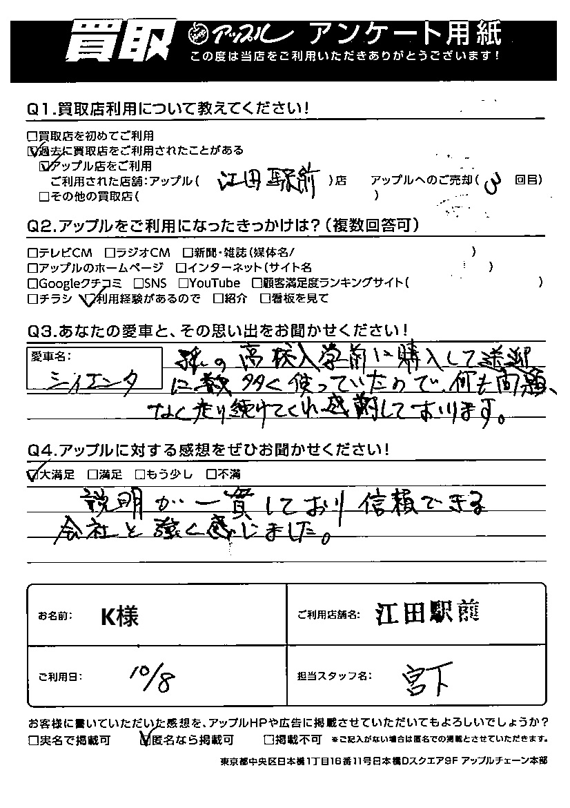 K様 車名:トヨタ シエンタ