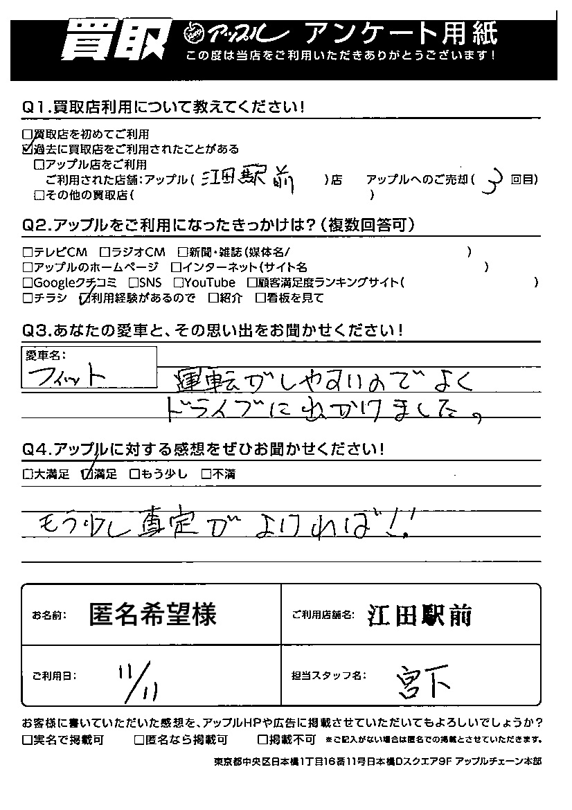 匿名希望様 車名:ホンダ フィット(H25年9月以降のハイブリッド含む)