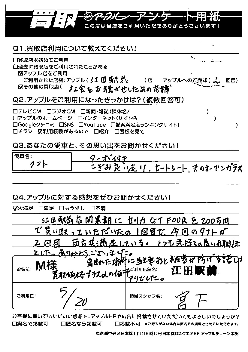 江田駅前店開業期にセリカGT Fourを200万円で買取っていただいたのが1回目で今回のタフトが2回目。両方満足し
