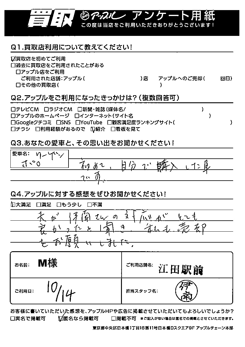 夫が伊南さんの対応がとても良かったと聞き、私も売却をお願いしました。
