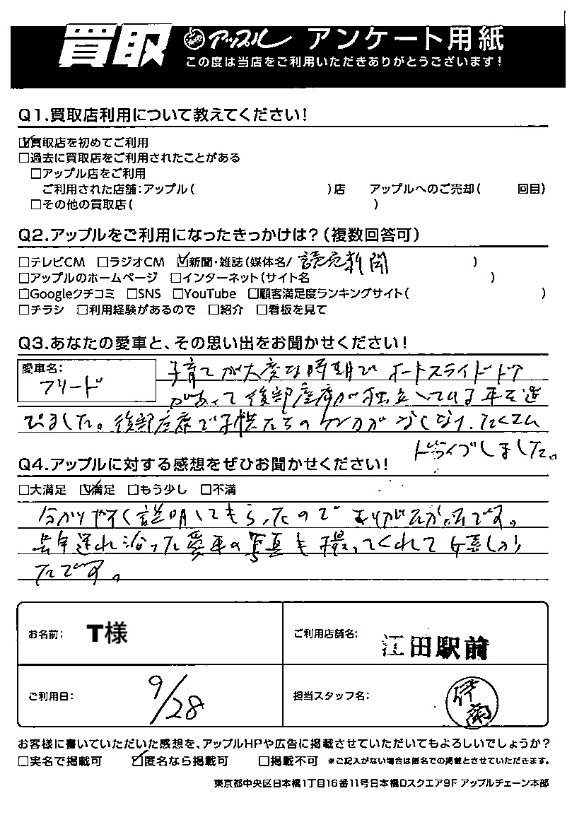 T様 車名:ホンダ フリード(H28年9月以降のハイブリッド含む)
