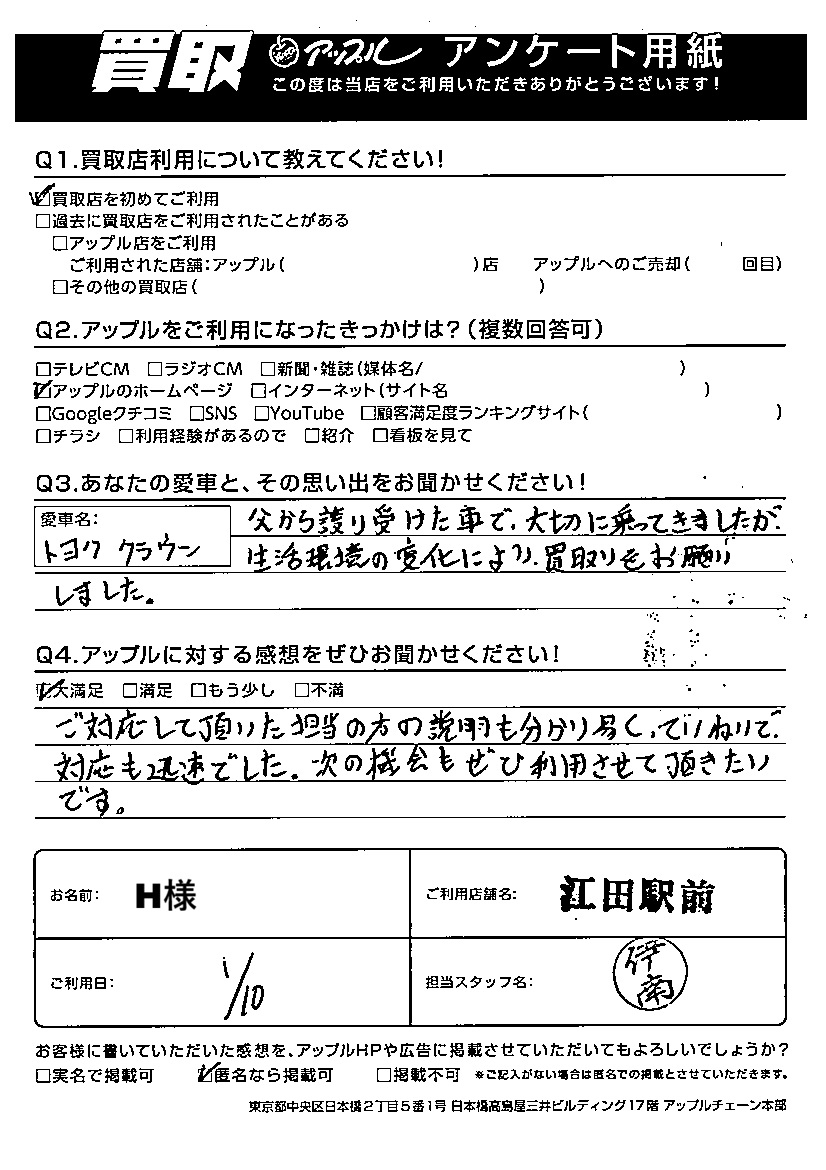 H様 車名:トヨタ クラウン(~H11年8月/H30年6月~)