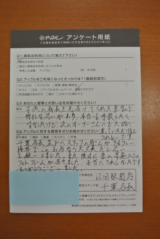I様 この度は、アップル江田駅前店をご利用頂き誠に有難う御座います。大変手入れが良いアルファードでしたので、次のオーナー様も喜んでいると思います。またお客様をご紹介してくださりありがとうございます。お礼状のお言葉をしっかり受け止め、励みにさせていただきます。お近くをお通りの際は、是非遊びにいらしてください。