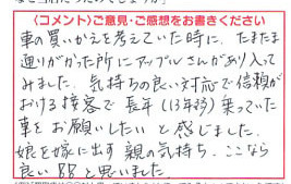 車の買い替えを考えていた時に、たまたま通りがかった所にアップルさんがあり、入ってみました。気持ちの良い対応で、信頼がおける接客で、長年(13年弱)乗っていた車をお願いしたいと感じました。