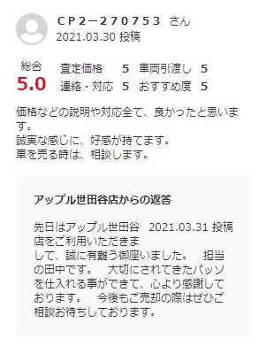 お車のご相談・ 査定だけでもOK! カンタン 入力 30秒 アップルがブランド買取始めました! お電話でも受付中! 受付時間10:00 ~ 19:00 0120-037-315 お車のご相談・ 査定だけでもOK! カンタン 入力 30秒 アップルがブランド買取始めました! お電話でも受付中! 受付時間10:00 ~ 19:00 0120-037-315 アップルがブランド買取始めました! お電話でも受付中! 受付時間10:00 ~ 19:00 0120-037-315 店舗情報 在庫車 スタッフ紹介 ブログ お客様の声 キャンペーン お得 無料査定 click お客様の声 ご記入日: 2021/04/05 東京都世田谷区 ご利用日:2021/3/13 グー買取より K様 車名:トヨタ パッソ 価格などの説明や対応全て、良かったと思います。 誠実な感じに、好感が持てます。 車を売る時は、相談します。 前へ 次へ お客様の声一覧を見る