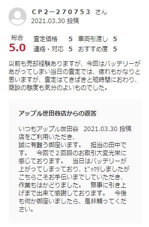 以前も売却経験ありますが、今回はバッテリーがあがってしまい当日の査定では、疲れもかなりと思いますが、査定はてきぱきと短時間におわり、商談の態度も気分のよいものでした。