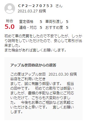 お車のご相談・ 査定だけでもOK! カンタン 入力 30秒 アップルがブランド買取始めました! お電話でも受付中! 受付時間10:00 ~ 19:00 0120-037-315 お車のご相談・ 査定だけでもOK! カンタン 入力 30秒 アップルがブランド買取始めました! お電話でも受付中! 受付時間10:00 ~ 19:00 0120-037-315 アップルがブランド買取始めました! お電話でも受付中! 受付時間10:00 ~ 19:00 0120-037-315 店舗情報 在庫車 スタッフ紹介 ブログ お客様の声 キャンペーン お得 無料査定 click お客様の声 ご記入日: 2021/04/06 東京都杉並区 ご利用日:2021/3/17 グー買取より K様 車名:レクサス CT (国内仕様 右H) 初めて車の売買をしたので不安でしたが、しっかり説明をしていただけたので、安心して取引が出来ました。 また機会があれば宜しくお願いします。 前へ 次へ お客様の声一覧を見る