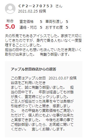 担当の田中さんも想いも汲んでいただき満足いく取引が出来ました。 有難う御座います。