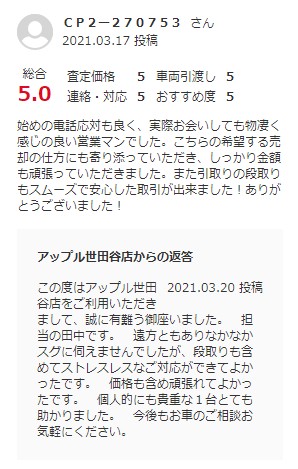 始めの電話応対も良く、実際お会いしても物凄く感じの良い営業マンでした。こちらの希望する売却の仕方にも寄り添っていただき、しっかり金額も頑張っていただきました。また引取りの段取りもスムーズで安心した取引が出来ました!ありがとうございました!