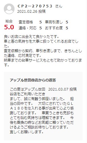 査定依頼から契約、車引き渡しまで、きちんとした連絡、応対満足です。
