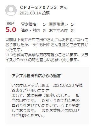 いつも誠実で真摯な対応有難うございます。又ライズかTcrossの時も宜しいお願い致します。