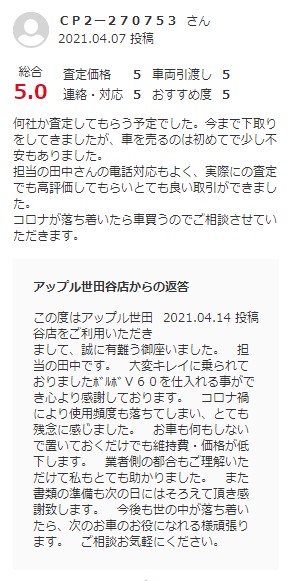 何社か査定してもらう予定でした。今まで下取りをしてきましたが、車を売るのは初めてで少し不安もありました。 担当の田中さんの電話対応もよく、実際にの査定でも高評価してもらいとても良い取引ができました。 コロナが落ち着いたら車買うのでご相談させていただきます。