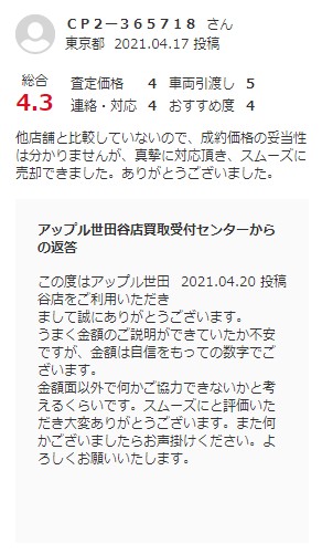 お車のご相談・ 査定だけでもOK! カンタン 入力 30秒 アップルがブランド買取始めました! お電話でも受付中! 受付時間10:00 ~ 19:00 0120-037-315 お車のご相談・ 査定だけでもOK! カンタン 入力 30秒 アップルがブランド買取始めました! お電話でも受付中! 受付時間10:00 ~ 19:00 0120-037-315 アップルがブランド買取始めました! お電話でも受付中! 受付時間10:00 ~ 19:00 0120-037-315 店舗情報 在庫車 スタッフ紹介 ブログ お客様の声 キャンペーン お得 無料査定 click お客様の声 ご記入日: 2021/04/26 東京都杉並区 ご利用日:2021/3/30 グー買取より O様 車名:トヨタ カローラセダン 他店舗と比較していないので、成約価格の妥当性は分かりませんが、真摯に対応頂き、スムーズに売却できました。ありがとうございました。 前へ 次へ お客様の声一覧を見る