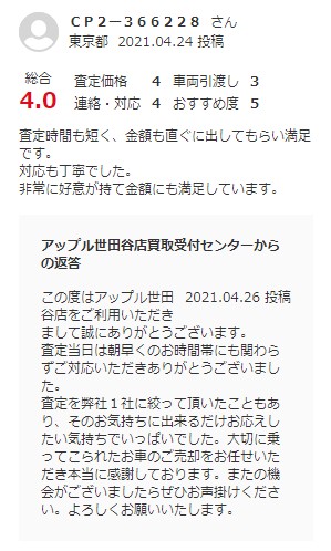 お車のご相談・ 査定だけでもOK! カンタン 入力 30秒 アップルがブランド買取始めました! お電話でも受付中! 受付時間10:00 ~ 19:00 0120-037-315 お車のご相談・ 査定だけでもOK! カンタン 入力 30秒 アップルがブランド買取始めました! お電話でも受付中! 受付時間10:00 ~ 19:00 0120-037-315 アップルがブランド買取始めました! お電話でも受付中! 受付時間10:00 ~ 19:00 0120-037-315 店舗情報 在庫車 スタッフ紹介 ブログ お客様の声 キャンペーン お得 無料査定 click お客様の声 ご記入日: 2021/04/26 東京都杉並区 ご利用日:2021/4/24 グー買取より S様 車名:トヨタ RAV4(R04年10月~RAV4 PHV含む) 査定時間も短く、金額も直ぐに出してもらい満足です。対応も丁寧でした。非常に好意が持て金額にも満足しています。 前へ 次へ お客様の声一覧を見る