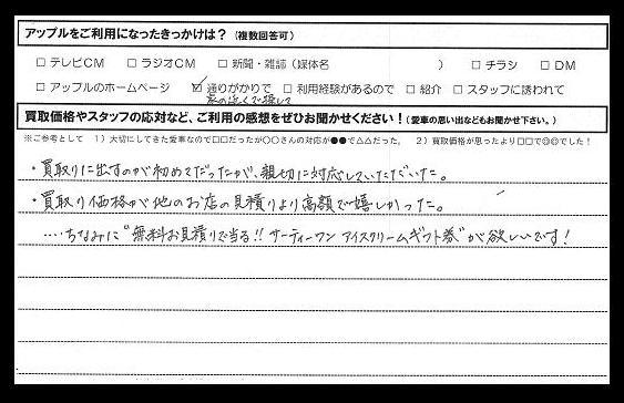 買取り価格が他のお店の見積りより高額で嬉しかった。
