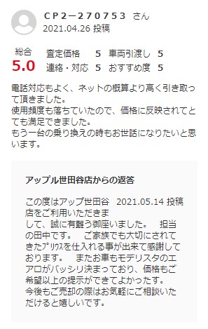 東京都目黒区 ご利用日:2021/4/18 グー買取より H様 車名:トヨタ プリウス(2023年3月~のPHVを含む)