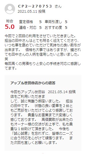 今回で2回目の利用をさせていただきました。 担当の田中さんはとても明るく迎えてくださり、いつも車を褒めていただけて気持ちの良い取引が出来ます。 価格も大事ではありますが、騙されても田中さんの人柄を信用したいと思いました。笑