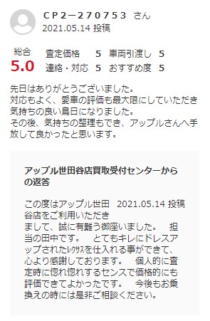 対応もよく、愛車の評価も最大限にしていただき気持ちの良い鳥日になりました。