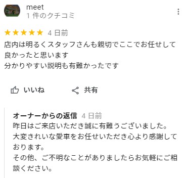 お車のご相談・ 査定だけでもOK! カンタン 入力 30秒 アップルがブランド買取始めました! お電話でも受付中! 受付時間10:00 ~ 19:00 0120-037-315 お車のご相談・ 査定だけでもOK! カンタン 入力 30秒 アップルがブランド買取始めました! お電話でも受付中! 受付時間10:00 ~ 19:00 0120-037-315 アップルがブランド買取始めました! お電話でも受付中! 受付時間10:00 ~ 19:00 0120-037-315 店舗情報 在庫車 スタッフ紹介 ブログ お客様の声 キャンペーン お得 無料査定 click お客様の声 ご記入日: 2021/05/11 千葉県八千代市 ご利用日:2021/5/11 Googleクチコミより S様 車名:トヨタ アクア 店内は明るくスタッフさんも親切でここでお任せして良かったと思います分かりやすい説明も有難かったです 前へ 次へ お客様の声一覧を見る