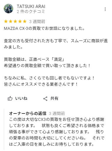 東京都大田区 ご利用日:2021/4/23 Googleクチコミより A様 車名:マツダ CX-3