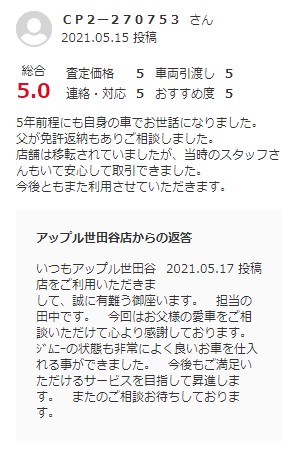 東京都杉並区 ご利用日:2021/5/2 グー買取より A様 車名:スズキ ジムニー
