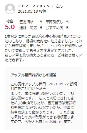 1度査定に伺った時は次の車の納期が見えなかったのもあり、相場の案内をいただきました。それから日数は経ちましたが、しっかりと評価をいただいて買取ってもらえ大変満足できました。