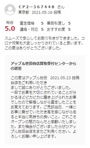 お車のご相談・ 査定だけでもOK! カンタン 入力 30秒 アップルがブランド買取始めました! お電話でも受付中! 受付時間10:00 ~ 19:00 0120-037-315 お車のご相談・ 査定だけでもOK! カンタン 入力 30秒 アップルがブランド買取始めました! お電話でも受付中! 受付時間10:00 ~ 19:00 0120-037-315 アップルがブランド買取始めました! お電話でも受付中! 受付時間10:00 ~ 19:00 0120-037-315 店舗情報 在庫車 スタッフ紹介 ブログ お客様の声 キャンペーン お得 無料査定 click お客様の声 ご記入日: 2021/05/24 東京都目黒区 ご利用日:2021/5/8 グー買取より I様 車名:BMW Z4ロードスター スムーズで安心してお取り引きができました。コロナ対策も大変しっかりされていると思います。この度はありがとうございました。 前へ 次へ お客様の声一覧を見る