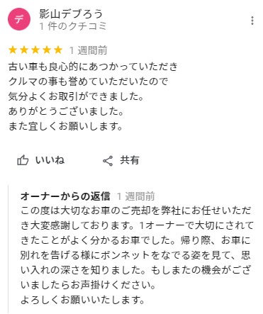 お車のご相談・ 査定だけでもOK! カンタン 入力 30秒 アップルがブランド買取始めました! お電話でも受付中! 受付時間10:00 ~ 19:00 0120-037-315 お車のご相談・ 査定だけでもOK! カンタン 入力 30秒 アップルがブランド買取始めました! お電話でも受付中! 受付時間10:00 ~ 19:00 0120-037-315 アップルがブランド買取始めました! お電話でも受付中! 受付時間10:00 ~ 19:00 0120-037-315 店舗情報 在庫車 スタッフ紹介 ブログ お客様の声 キャンペーン お得 無料査定 click お客様の声 ご記入日: 2021/05/25 東京都杉並区 ご利用日:2021/5/16 Googleクチコミより T様 車名:トヨタ プレミオ 古い車も良心的にあつかっていただきクルマの事も誉めていただいたので気分よくお取引ができました。ありがとうございました。また宜しくお願いします。 前へ 次へ お客様の声一覧を見る