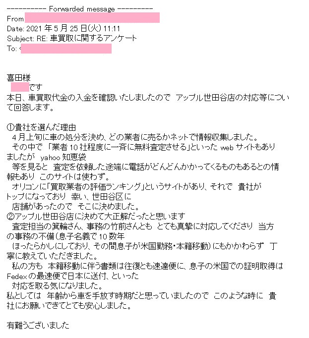 本日、車買取代金の入金を確認いたしましたので アップル世田谷店の対応等につい