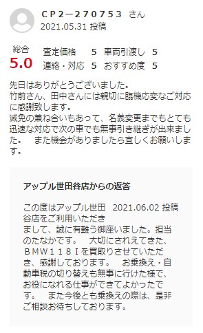 減免の兼ね合いもあって、名義変更までもとても迅速な対応で次の車でも無事引き継ぎが出来ました。 また機会がありましたら宜しくお願いします。
