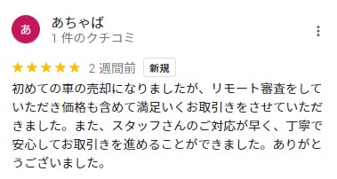 初めての車の売却になりましたが、リモート審査をしていただき価格も含めて満足いくお取引きをさせていただきました。また、スタッフさんのご対応が早く、丁寧で安心してお取引きを進めることができました。ありがとうございました。
