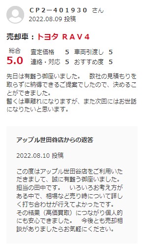 神奈川県横浜市 ご利用日:2022/8/7 鶴見区(GOOレビュー) K様 車名:トヨタ RAV4(R04年10月~RAV4 PHV含む)