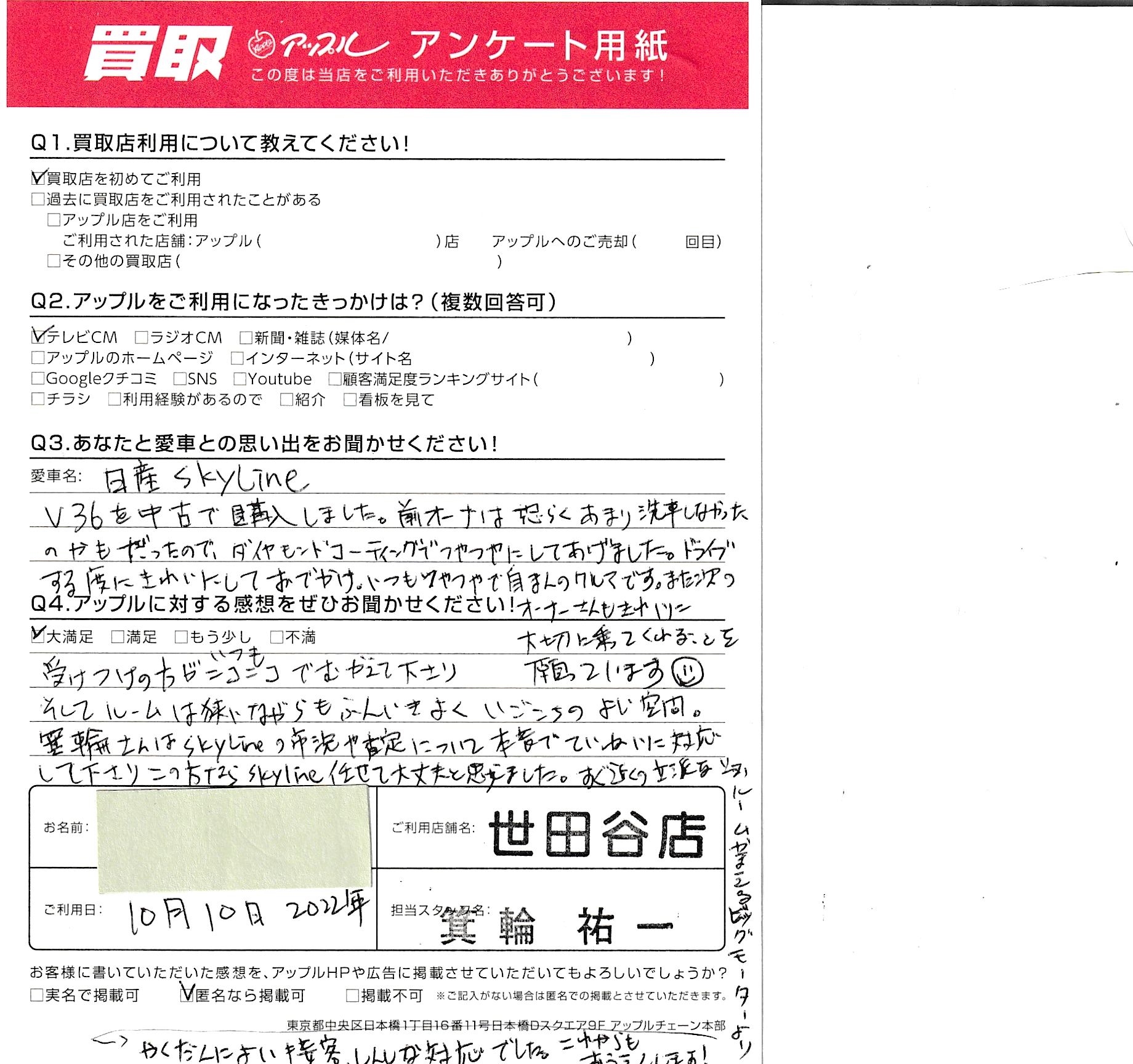 東京都 世田谷区 アンケート用紙より H様 車名:日産 スカイライン(セダン)