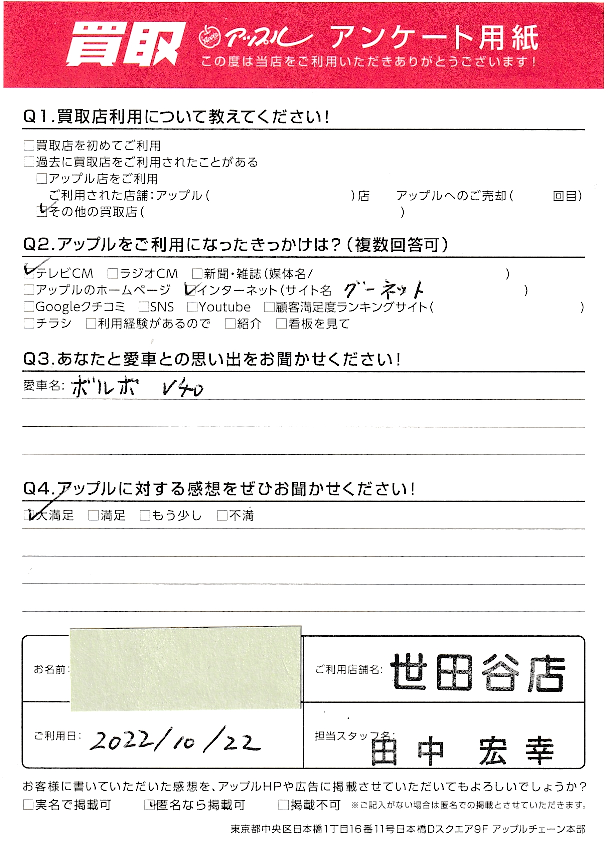 東京都 目黒区 アンケート用紙より K様 車名:ボルボ V40