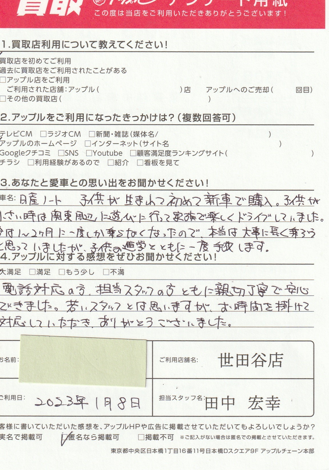 東京都杉並区 アンケート用紙より N様 車名:日産 ノート