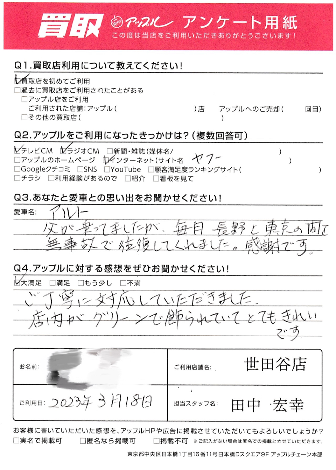 東京都世田谷区 アンケート用紙より I様 車名:スズキ アルト (2015年12月以降のワークス含む)