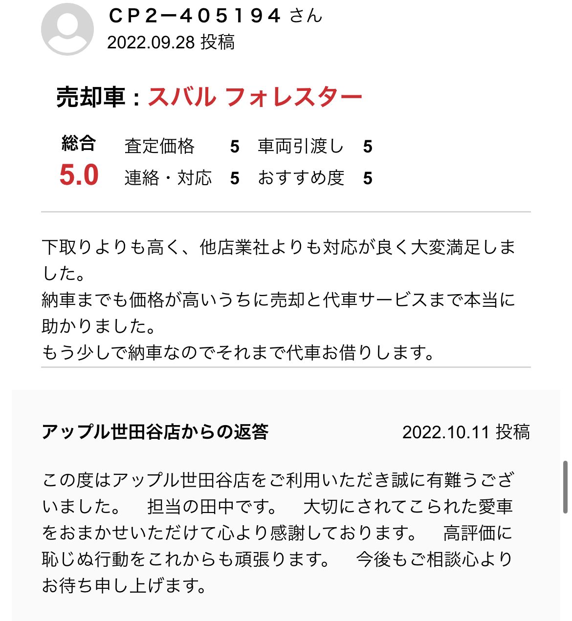 東京都世田谷区 GOOレビューより Y様 車名:スバル フォレスター