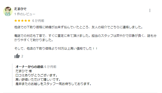 他店での下取り価格に納得が出来ず悩んでいたところ、友人の紹介でこちらに連絡しました。