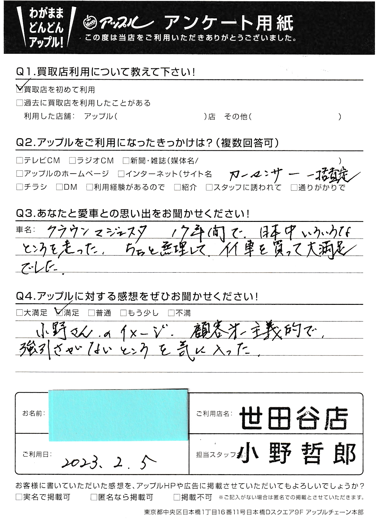 東京都世田谷区 アンケート用紙より H様 車名:トヨタ クラウンマジェスタ マジェスタ(クラウンマジェスタ)