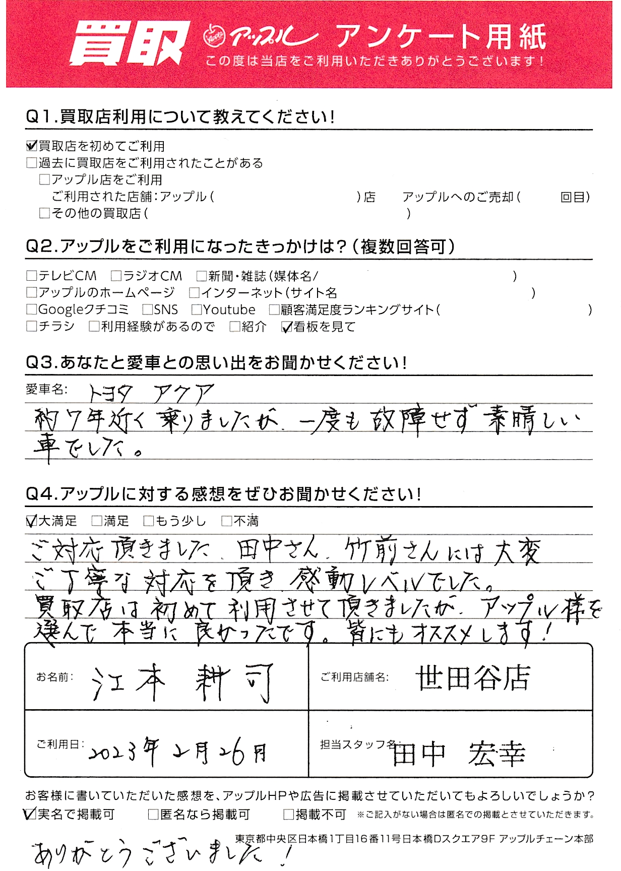 東京都目黒区 アンケート用紙より 江本 耕司様 車名:トヨタ アクア