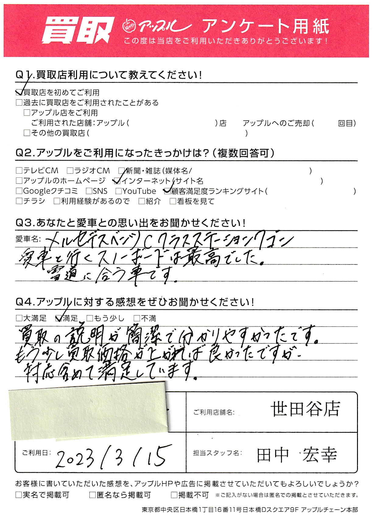 東京都杉並区 アンケート用紙より U様 車名:メルセデス・ベンツ Cクラスワゴン