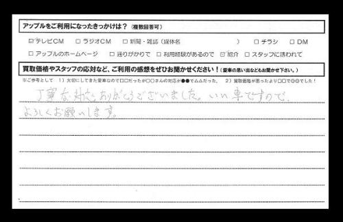 お忙しい中、二度もお店に足を運んでいただきましたが、金額の面でご期待に応えられて良かったです。良いお車を任せていただき本当にありがとうございます、今後ともどうぞよろしくお願いいたします。