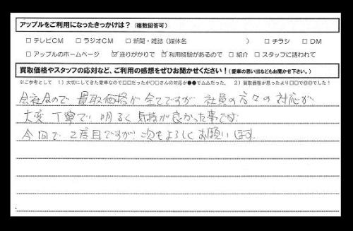 会社なので買取価格が全てですが社員の方々の対応が大変丁寧で明るく気持ちが良かった事です。今回で二度目ですが次もよろしくお願いします。