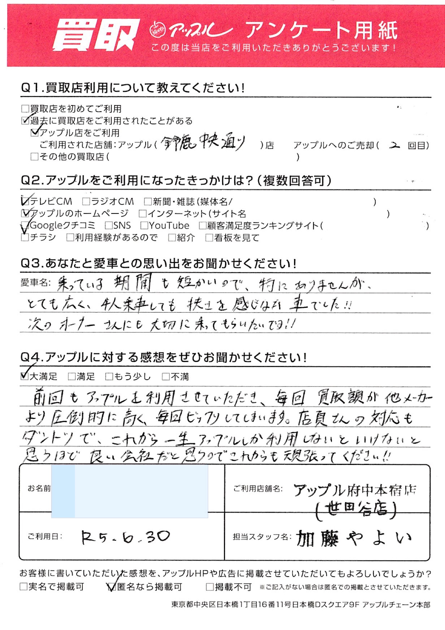東京都国分寺市 アンケート用紙より S様 車名:ホンダ N-BOX