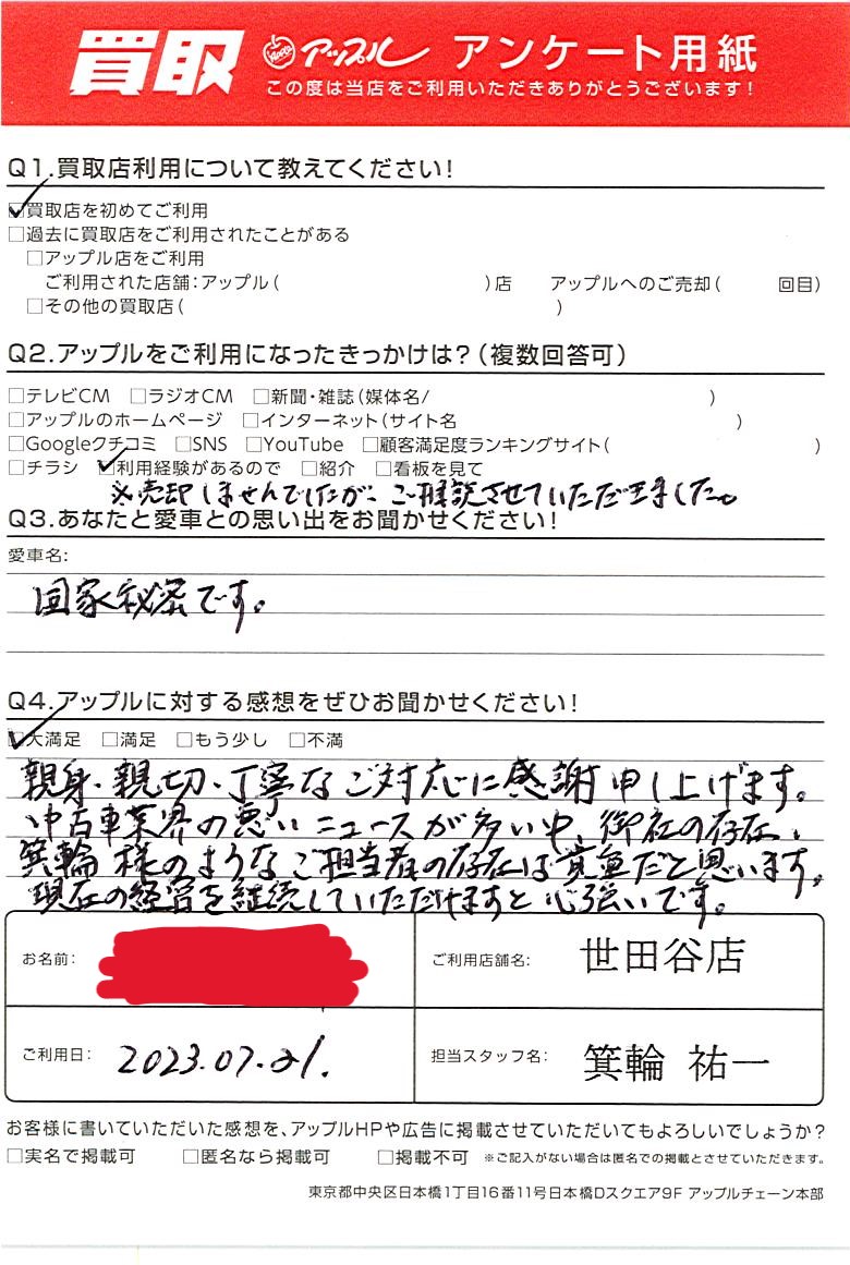 中古車業界の悪いニュースが多い中、御社の存在、箕輪様のようなご担当者の存在は貴重だと思います。