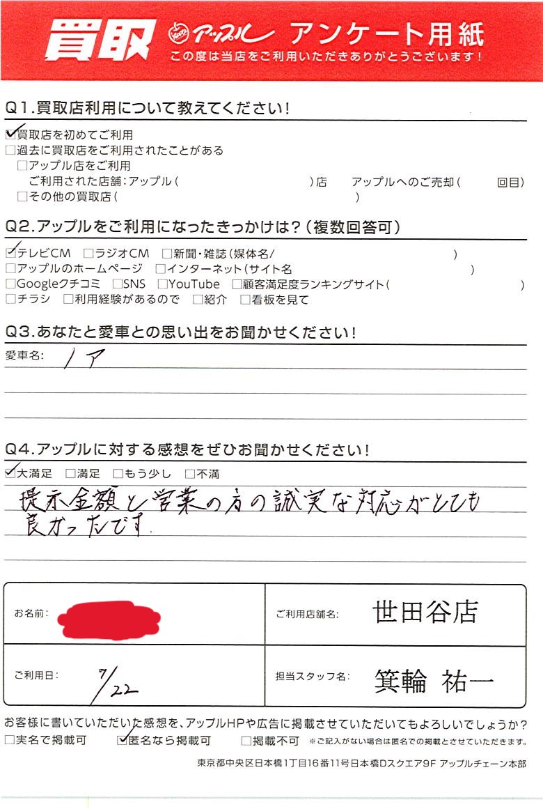 東京都大田区 アンケート用紙より I様 車名:トヨタ ノア