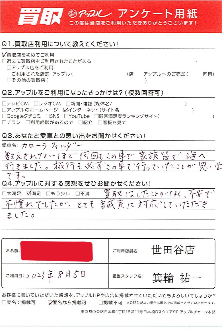 世田谷区渋谷 アンケート用紙より H様 車名:トヨタ カローラフィールダー フィールダー(カローラ)