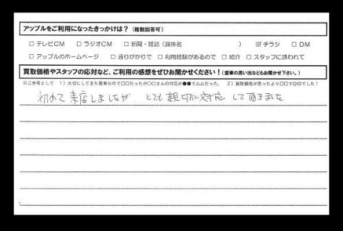 お車のご相談・ 査定だけでもOK! カンタン 入力 30秒 アップルがブランド買取始めました! お電話でも受付中! 受付時間10:00 ~ 19:00 0120-037-315 お車のご相談・ 査定だけでもOK! カンタン 入力 30秒 アップルがブランド買取始めました! お電話でも受付中! 受付時間10:00 ~ 19:00 0120-037-315 アップルがブランド買取始めました! お電話でも受付中! 受付時間10:00 ~ 19:00 0120-037-315 店舗情報 在庫車 スタッフ紹介 ブログ お客様の声 キャンペーン お得 無料査定 click お客様の声 ご記入日: 2010/02/14 杉並区在住 U様 【お客様から頂いたメッセージ】初めて来店しましたが、とても親切に対応して頂きました【担当スタッフから】今後もご近所さま故、サービス向上を目指して参りますのでお茶にでも寄ってください。 前へ 次へ お客様の声一覧を見る