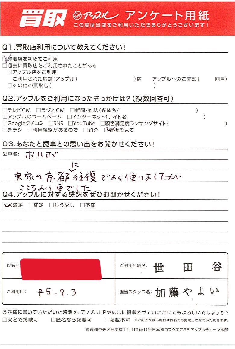 東京都世田谷区 アンケート用紙より A様 車名:ボルボ V50