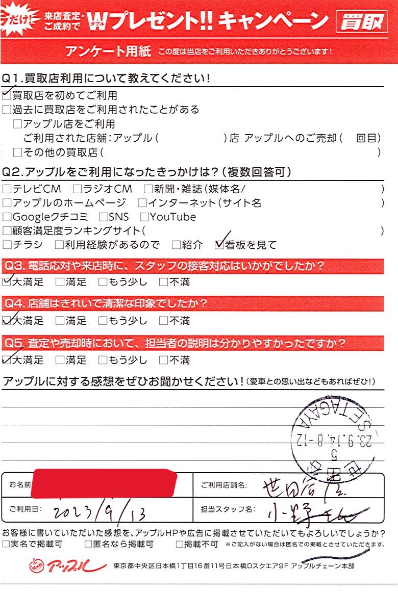 東京都世田谷区 アンケート用紙より I様 車名:BMW 5シリーズ
